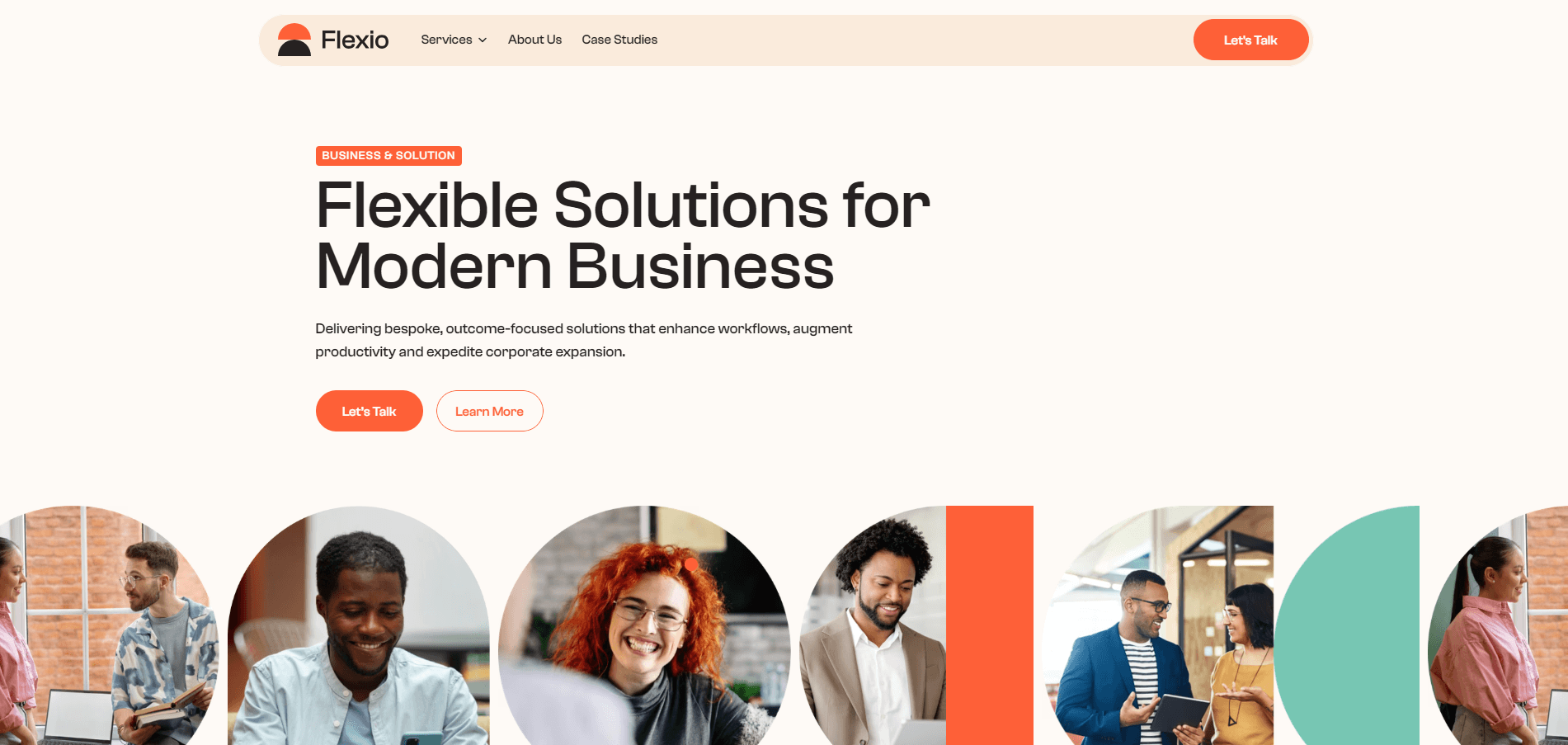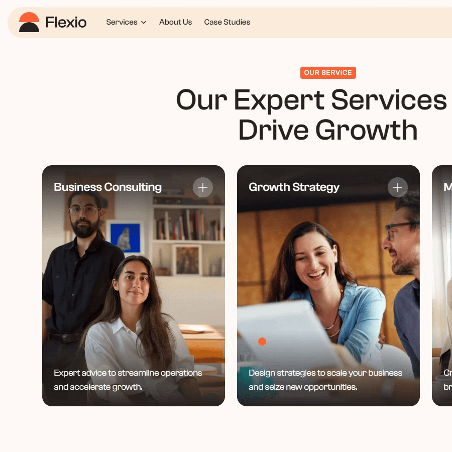 Flexio es una consultora de soluciones empresariales que diseña servicios a medida para optimizar procesos, incrementar productividad y escalar negocios de startups y grandes empresas. En Kaizen creamos para Flexio una interfaz de tonos cálidos y formas orgánicas, con un hero claro y CTAs destacados, secciones circulares que resaltan “Business Consulting”, “Growth Strategy” y “Marketing Strategy”, y un selector de industrias interactivo que evidencia su expertise sectorial, mientras los estudios de caso se despliegan en módulos expandibles para involucrar al visitante.
